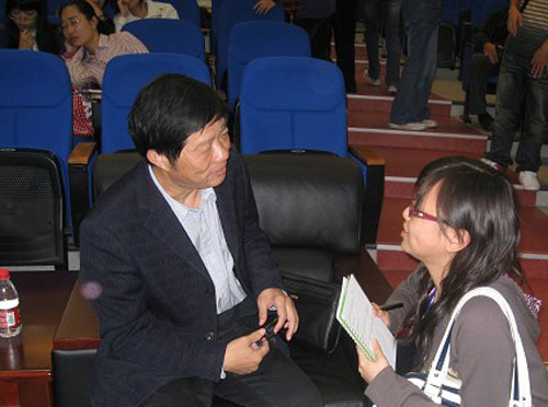 陈晓慰教授在科报厅主持本次报告会。首先由林大津教授进行“‘交际研究性’英语专业构想与专业训练”的报告。林大津教授用生动风趣的语言,图文并茂地分析了当前大学英语专业的教学困境及英语专业就业前景,现场气氛活跃。随后,陈维振教授做了关于《文本阐释创造与约束》的报告,并回答了现场学生的疑问。