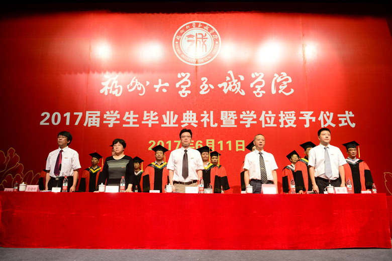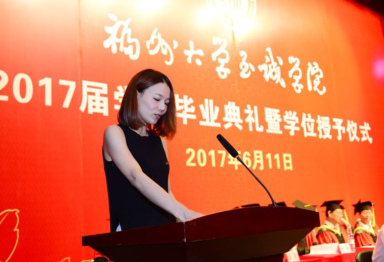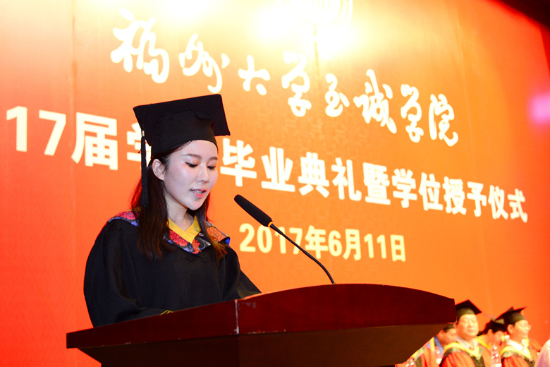 典礼在庄严的国歌声中拉开帷幕。朱敏琛副院长首先宣读了2017届首批毕业学生名单和2017届优秀毕业生名单。随后,外国语系日语教师桥本知佳老师作为教师代表发言,表达了对毕业生的祝福之意。她鼓励毕业生们要努力创造属于自己的新轨道,去改变自己的世界。她希望毕业生们要做到“有足够的信心”、“学会关注与思考世界的动态”、“不能被学识束缚”,要活在当下勿好高骛远,同时要果断挑战自我,总结挫折经验,不断取得进步。优秀毕业生代表化学工程系龚燕同学也上台发言,表达对母校的眷恋、不舍与祝福,对师长的感激和对父母的感恩,并号召全体毕业生们牢记母校的教诲,用所学到的知识和能力去服务社会,为梦想不懈努力。