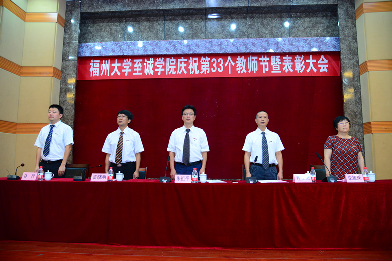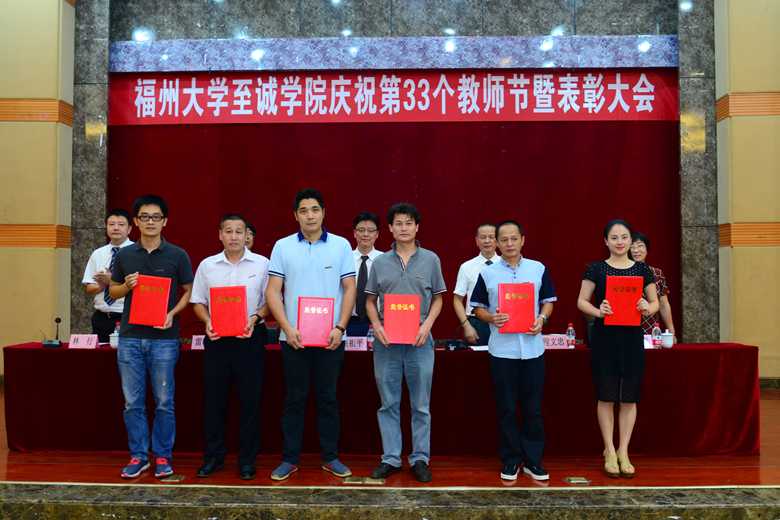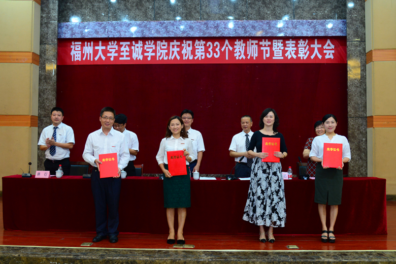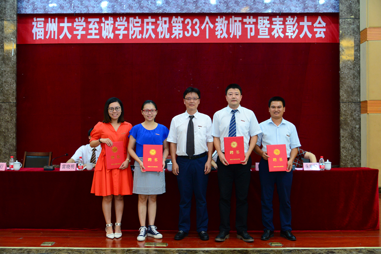 伴着雄浑的国歌声,大会正式开始。在朱敏琛副院长宣读完表彰决定后,颁奖仪式首先举行。“2015-2017年度福建省优秀教师”朱祖平院长,2017年院优秀教师黄巧云等5人,2017年院优秀教育工作者林闽卿等6人,2017年院优秀科研工作者孙磊、洪防璇,2017年福建省高校新世纪优秀人才计划入选者陈江彬,2017年福建省杰出青年科研人才计划入选者张书泉、陈雅珊,2016年度省教学成果奖和院教学成果奖获得者,福州大学第18届青年教师“最佳一节课”竞赛奖及院2017年“最佳一节课”竞赛奖获得者等教师代表分别上台领奖。随后举行的是2017年副高专业技术职务聘任仪式,朱祖平院长一一为新晋为副高职称的4位老师颁发了聘书。