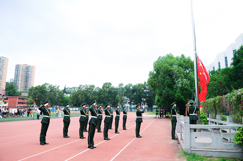 上午7时,院国旗护卫队队员精神抖擞地迈着正步,护卫着五星红旗来到旗杆下。伴随着庄严的国歌声,鲜艳的五星红旗冉冉升起,全场师生肃立,向五星红旗行注目礼。