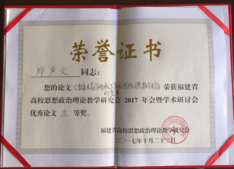 日前,省高校思想政治理论教学研究会2017年学术年会在泉州华侨大学召开。全省50多所高校100多名从事思想政治理论课教学的教师参加学术年会。在会议收到的70多篇论文中,德州扑克app推荐 马克思主义理论教学研究部郭伟副教授的论文《高校思想政治理论课教学现状和对策分析》 和郑声文副教授的论文《教育生态学视域下高校思政课教学生态的变革》分别获得年会优秀论文二等奖和三等奖。
