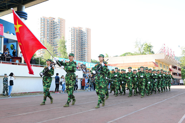伴随着《中华人民共和国国歌》的歌声,大会正式拉开了序幕。国旗护卫队方阵及各系军训方阵按秩序入场,同学们步伐整齐划一、口号高亢嘹亮,满怀豪情、斗志昂扬地走向主席台接受领导来宾的检阅。紧接着,军体拳方阵、格斗术表演方阵给大家呈现了气势如虹的精彩表演,震撼全场。