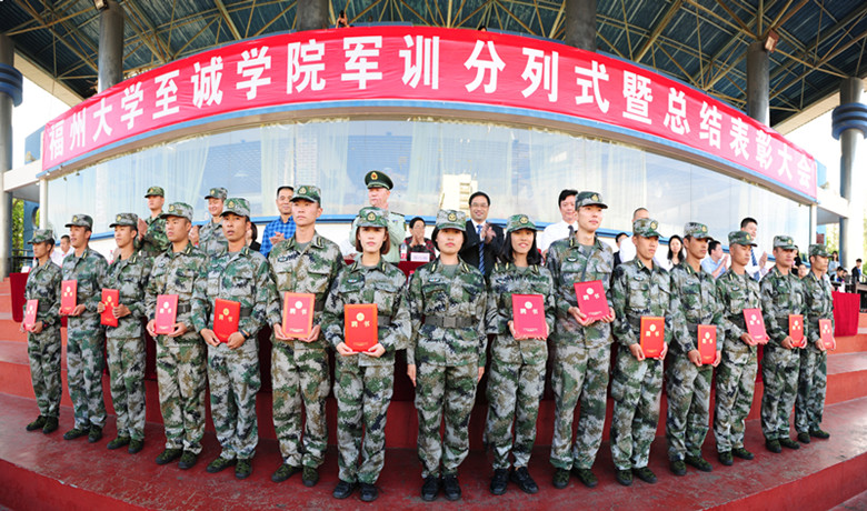 随后,大会宣布2017级新生军训工作各项评比结果和特聘军训教官名单,部队首长与院领导一同为获得军训表彰的先进集体和个人颁奖,并为特聘为军训团教官的退役复读大学生颁发聘书。军训团三营十一连等6个单位获得军训会操先进集体;东区1#楼105等60间学生宿舍获得军训标兵宿舍称号;陈洁等403名学员被评为“军训优秀学员”;吴靖宇等33位教官被评为“军训优秀教官”;吴迪等12老师被评为“军训优秀指导员”;军训团参谋长刘超中校、军训团副参谋长吴世东中尉被评为“军训团优秀指挥员”。