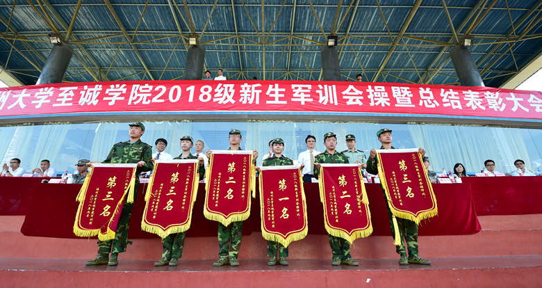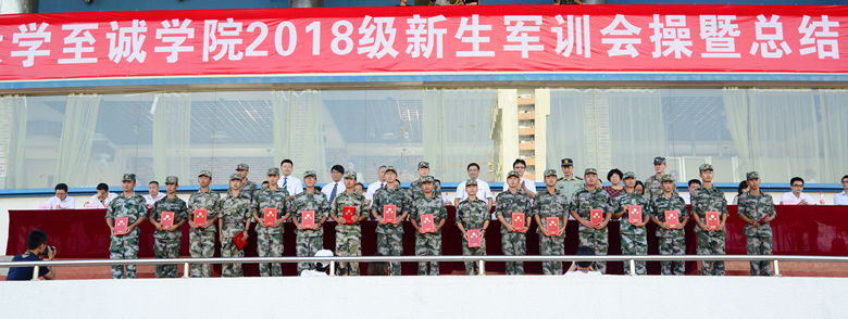 随后,大会宣布2018级新生军训工作各项评比结果和特聘军训教官名单,部队首长与院领导一同为获得军训表彰的先进集体和个人颁奖,并为特聘为军训团教官的退役复读大学生颁发聘书。军训团一营一连等6个单位获得军训会操先进集体;东区6#楼216等50间学生宿舍获得军训文明宿舍称号;敖梦琪等291名学员被评为“军训优秀学员”;郑斯瀚等45位教官被评为 “军训优秀教官”;王德峰等10位老师被评为“军训优秀指导员”;军训团参谋长盛云飞、军训团副参谋长韦江韩少校被评为“军训优秀指挥员”。
