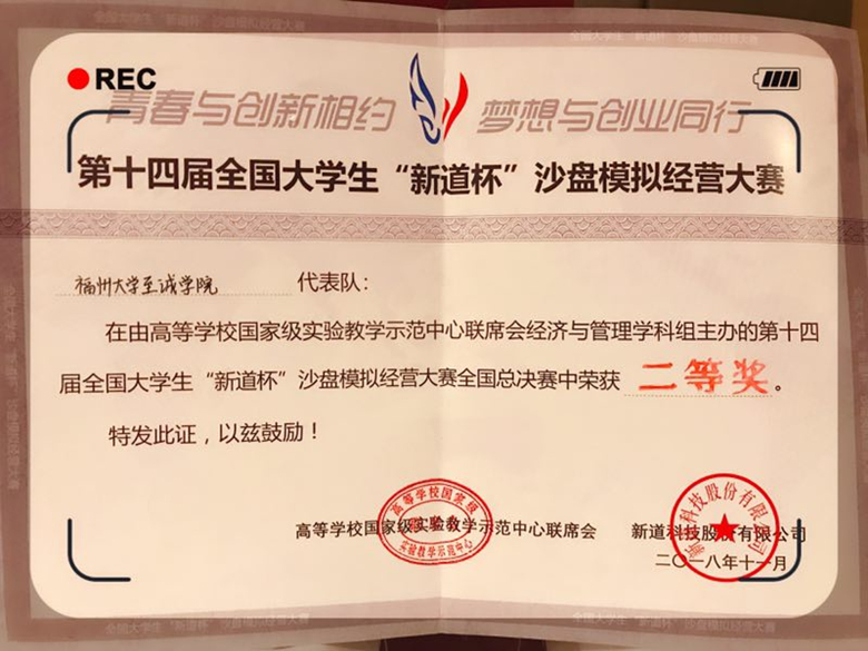 代表队在郭鸿琼、吴迪老师带领下,经过激烈比赛,获得第十四届“新道杯”全国总决赛二等奖的好成绩。