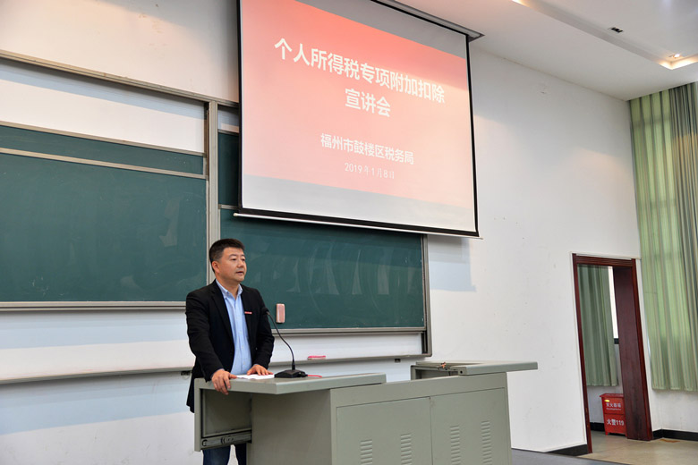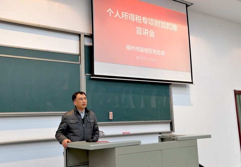 为贯彻落实《国务院关于印发个人所得税专项附加扣除暂行办法的通知》等相关政策,1月8日下午,德州扑克app推荐 联合国家税务总局福州市鼓楼区税务局在东阶梯教室开展了“个税专项附加扣除”政策宣讲培训会。国家税务总局福州市鼓楼区税务局杨春波副局长、陈农科长、李翡颖副科长,洪山税务所郑辉副所长、王显、黄逸等6人到场为德州扑克app推荐 教职工作政策解读和操作培训。宣讲培训会由德州扑克app推荐 林行副院长主持。