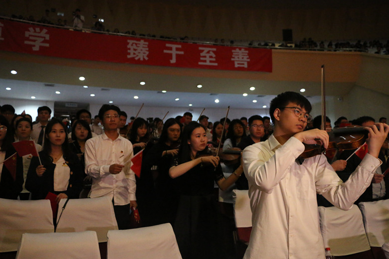 表彰大会在一场别出新意的快闪合唱中落下帷幕。在院弦乐团的伴奏下,全体参会人员跟随院合唱团同学们一同唱响了《我和我的祖国》,表达了心中的爱国之情。