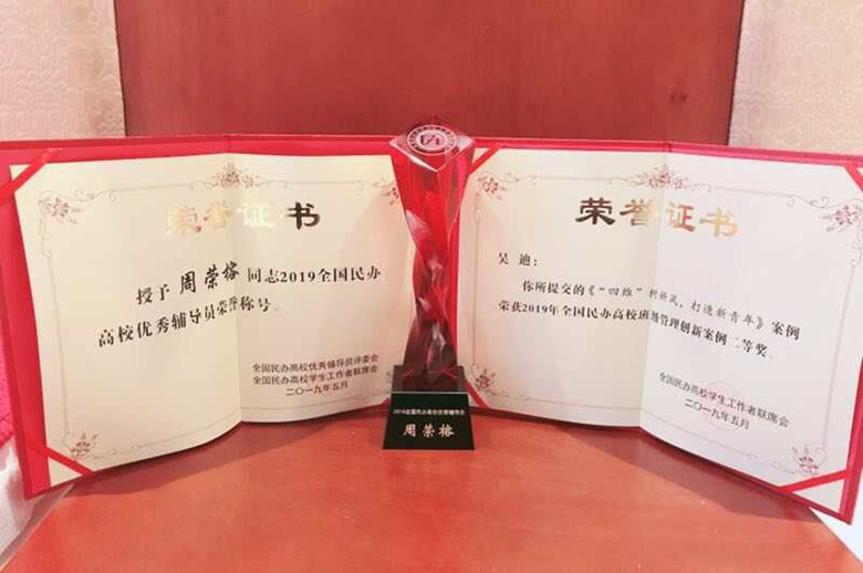 德州扑克app推荐 创意与设计系团委书记周荣榕荣获2019年“全国民办高校优秀辅导员”称号,经济管理系团委书记吴迪提交的工作成果《“四维”新学风,打造新青年》获得了2019年“全国民办高校班级管理创新案例二等奖”。