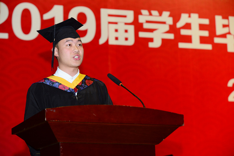 土木工程系陈普洋同学作为2019届优秀毕业生代表发言,他深情回忆了四年来大学生活的点滴,号召全体毕业生铭记“明德博学,臻于至善”的院训,立鸿鹄志,做新时代的奋斗者。随后,生物工程系系主任刘树滔教授作为教师代表发言,他表达了对2019届毕业生的祝福,寄语毕业生们不忘初心、迎接挑战,创造属于自己的辉煌。