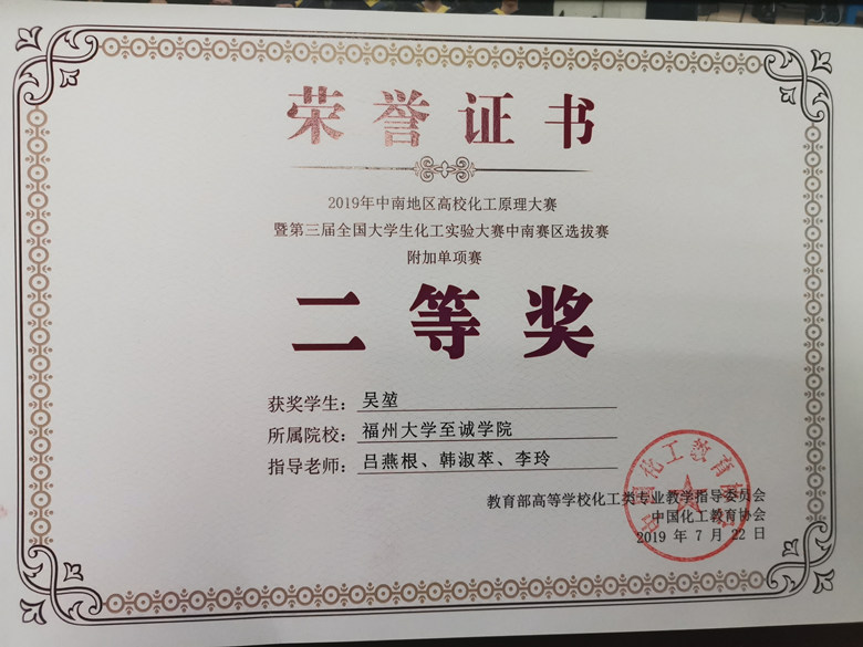 化学工程系学生团队在大赛中荣获三等奖一项,附加单项奖一等奖一项,二等奖一项。