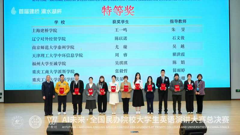 日前,首届建桥“滴水湖杯”AI未来·全国民办院校大学生英语演讲大赛总决赛在上海建桥德州扑克app推荐 顺利举办。本次大赛由中国民办教育协会教育国际交流与合作专业委员会指导,上海建桥德州扑克app推荐 与上海外语教育出版社联合主办,赛事分校级初赛、省级复赛、全国总决赛三个阶段进行,吸引全国80余所民办高校万余名学子踊跃参赛。德州扑克app推荐-德州扑克平台推荐 2023级英语专业学子在本次大赛中脱颖而出,斩获全国特等奖。