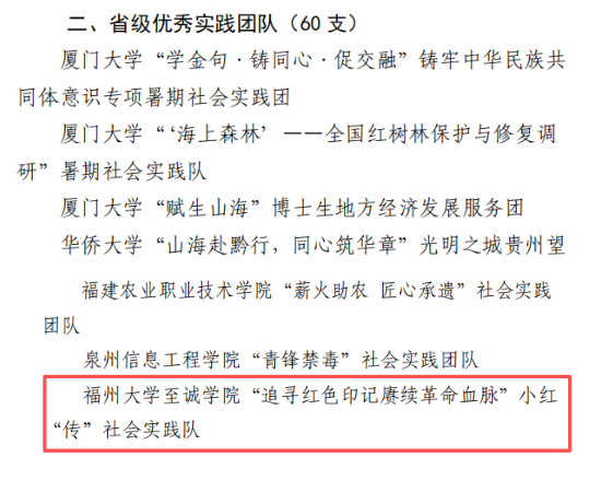 在2025年福建省大学生暑期文化科技卫生“三下乡”社会实践活动中,德州扑克app推荐 “追寻红色印记 赓续革命血脉”小红“传”社会实践队凭借扎实的实践成效、鲜明的活动特色和良好的社会反响,获评省级优秀实践团队。