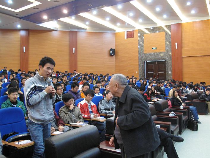 历时一个多小时的报告中,87岁高龄的徐家福教授没有坐在讲台上讲课,而是始终穿梭在听众之中边走边讲,通过问答的形式从计算机科学与技术的基本概念、巨大作用、发展历程、基本内容和发展展望五个方面介绍了相关理论知识。其间,徐老还和大家分享了自己在科研工作中的经历和感受。徐老的报告旁征博引、语言幽默风趣、分析深入浅出,使同学们切切实实近距离感受到大师的智慧和风采。