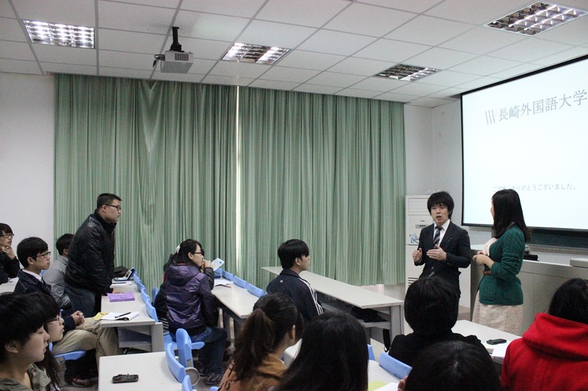 会上,土居智田副教授简单介绍了日本长崎的地理位置、生活环境和文化氛围,表示去年发生的地震、海啸、核辐射事件对长崎并无影响,大家可以放心地去长崎外语大学留学,运用精美的幻灯片向在场的同学们展示了在长崎外国语大学的生活、学习及今后就业前景,并悉心解答了现场同学的各项问题。