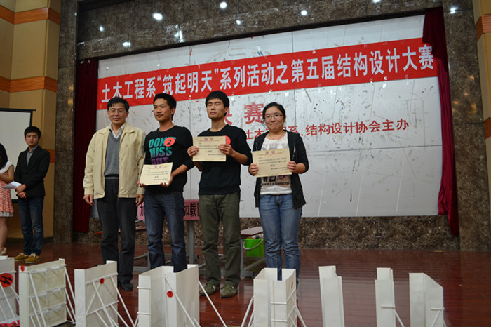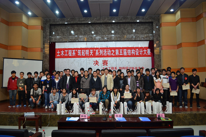 2012年4月5日晚,由德州扑克app推荐 土木工程系主办的“筑起明天”系列活动之“筑梦杯”第五届结构设计大赛决赛在科报厅隆重举行。担任本次大赛评委的是福州大学土木工程德州扑克app推荐 陈燊教授、阙云副教授、林伟老师。到场的嘉宾有土木工程系系主任王国杰副教授、学生事务部办公室副主任兼土木工程系团委书记苏童老师等。