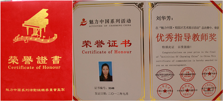 音乐系刘华芳老师指导学生参加多项比赛,荣获多项国际性、全国性赛事优秀指导教师奖。7月,指导学生荣获国际钢琴教育协会、中国音乐舞蹈教育协会主办的“魅力中国·校园才艺展示活动”全国总决赛金奖,荣获“优秀指导教师奖”。 8月,指导学生荣获香港国际艺术专业等级评审协会、中国国际文化艺术交流协会主办的第三届“香港国际钢琴公开赛”总决赛二等奖,刘荣获“国际优秀导师奖”;指导学生荣获世界文化交流协会、香港手拉手青少年文化交流协会主办的“首届国际青少年儿童音乐舞蹈大赛”香港总决赛金奖,荣获“优秀指导教师奖”。