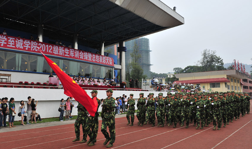 2012级新生军训画上圆满的句号。2012级新生在为期两周的军训过程中,圆满地完成了包括队列训练、军体拳、内务卫生整理、军事理论教育等任务,同学们在军训中进一步增强的国防观念、纪律意识、集体观念和文明修养,将成为他们今后学习生活中宝贵的精神财富,激励他们更好地在大学时光里奋斗、成长、成才。