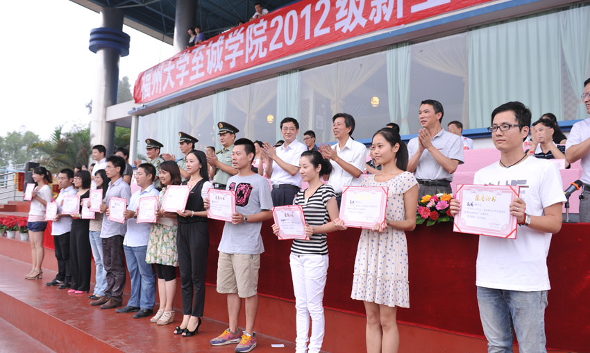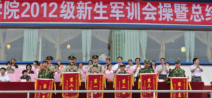 2012级新生军训表彰决定》。大会对军训先进单位和个人进行了表彰并举行颁奖仪式。军训团一营五连等6个单位获的军训会操先进集体,西区公寓3号楼103A等54间军训团学生宿舍获得军训内务卫生先进宿舍称号,汪泽等252位同学被评为“军训优秀学员”,赵荷老师等13位辅导员被评为“军训优秀新生辅导员”。