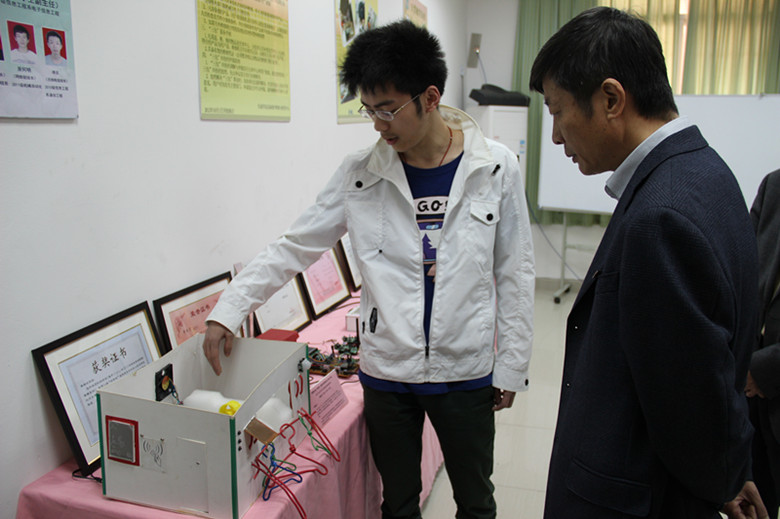 在院大学生创新活动中心,付校长还考察了大学生设备维护维修与研发中心,与师生们亲切交谈,听取了学生“设备维护维修与研发”的汇报,了解询问学生获专利作品情况及中心的业务开展情况。付校长对大学生设备维护维修与研发中心取得的成绩表示赞赏,鼓励同学们大胆创新、协同创新,在学中干,在干中学,努力把自己打造成创新型人才。