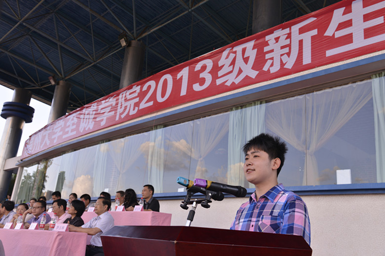 来自材料工程系的郑明昊同学代表2013级新生代表在典礼上发言,表达了对大学生活的向往和规划,倡议全体新生在大学期间发挥青春的正能量,用今日的汗水去锻造我们明日的辉煌,一起为梦想为未来奋斗出一片属于自己的天空。