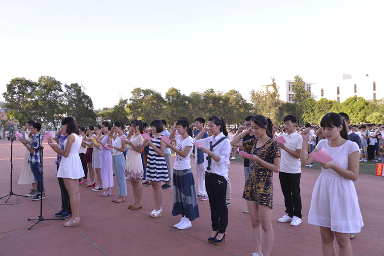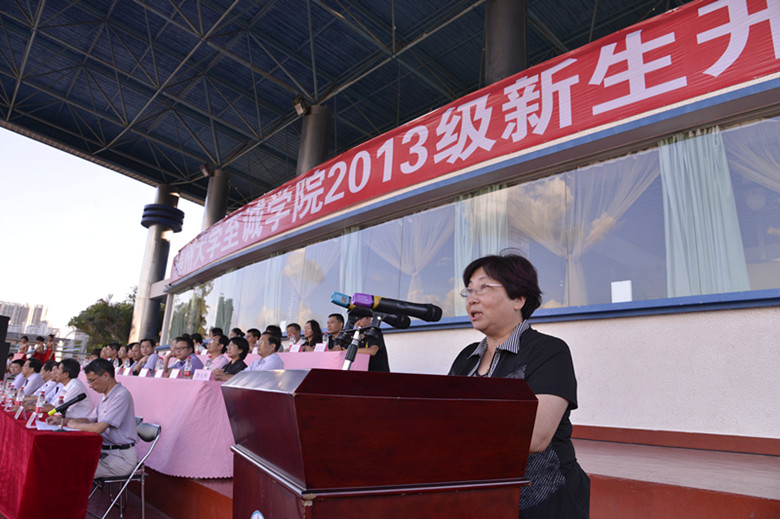 开学典礼在院铜管乐队演奏的嘹亮宏伟国歌声中拉开了序幕。首先举行了新生宣誓仪式,2013级全体新生在典礼上庄严宣誓:时刻铭记祖国赋予的尊严,铭记人民给予的荣耀,铭记父母寄予的希望,铭记恩师赐予的教诲,践行院训精神,遵纪守法、诚实守信、克己修身、团结友爱、求知创新、勤于实践,努力把自己培养成“品德优良、基础厚实、知识广博、专业精深”的人才,努力为实现国家繁荣富强和中华民族的伟大复兴奋斗终身。