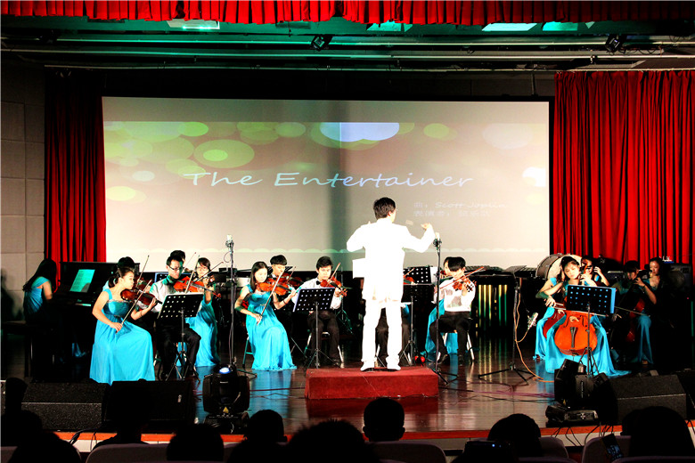 音乐会开场,院爵士乐队带来的一曲《Evil ways》中拉开了音乐会的序幕。明快的节奏、优美的旋律,将现场观众直接引入了爵士音乐的精彩殿堂。紧接着,乐队还演出了《007》系列电影主题曲《James Bond Theme》,引得观众掌声不断。随后,艺术中心弦乐队、流行乐队、打击乐队等队伍轮番上场,带来了精彩演出:弦乐队带来了《The Entertainer》和《爵士拨奏乐》两首曲目,美妙的旋律让观众们沉醉其中;流行乐队带来了歌曲联唱《Somebody & 爱不完》、《Rose,Rose I love you》、《Vintage Coffee》等曲目,将观众热情彻底点燃,博得了阵阵喝彩;打击乐队带来了精彩的打击乐表演《Technology》、《Sex and the city》,将音乐会气氛推向了最高潮。期间, 任聪德同学的萨克斯独奏《Misty》、陈晓卉老师与廖舒文同学的双钢表演《Brazileira》、李雪老师的钢琴独奏《主题与变奏》等演出穿插其中,也是惊艳全场,让观众们领略到了表演者的精彩技艺。音乐会最后,爵士乐队再次压轴出场,带来了爵士乐《Over the rainrow》,为音乐会划上了圆满记号。