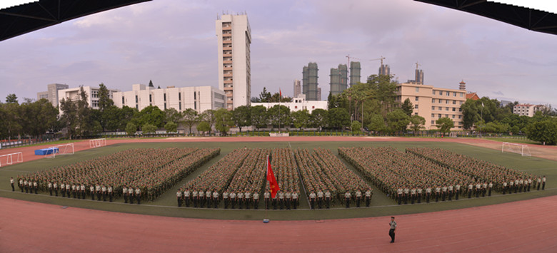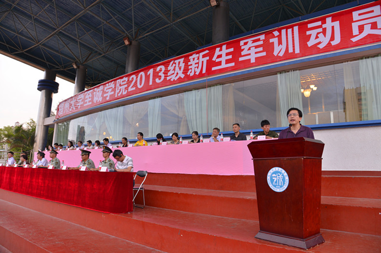 下午四时,2013级军训团新生有序步入东区篮球场。在经过队伍整顿和纪律的强调之后,本次军训动员大会正式开始。全体参会人员起立,奏唱《中华人名共和国国歌》。随后,院党委专职副书记陈为旭研究员发表讲话,他从国际关系的视角出发,结合我国国情与实际,强调了对大学生开展国防教育和军事训练的重要性,要求全体新生学习承训部队官兵思想过硬、作风过硬、技术过硬的本领,全面提升综合素质。军训团团长兼政委王明星中校也为新生作了军训动员,他讲述了部队的光荣历史,同时他对军训教官提出了要锻炼出钢铁般的意志的要求,并要求同学们在军训中发扬不怕吃苦的精神,真正做到意志如钢,坚不可摧。