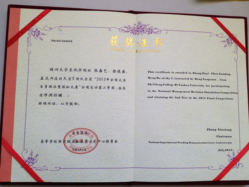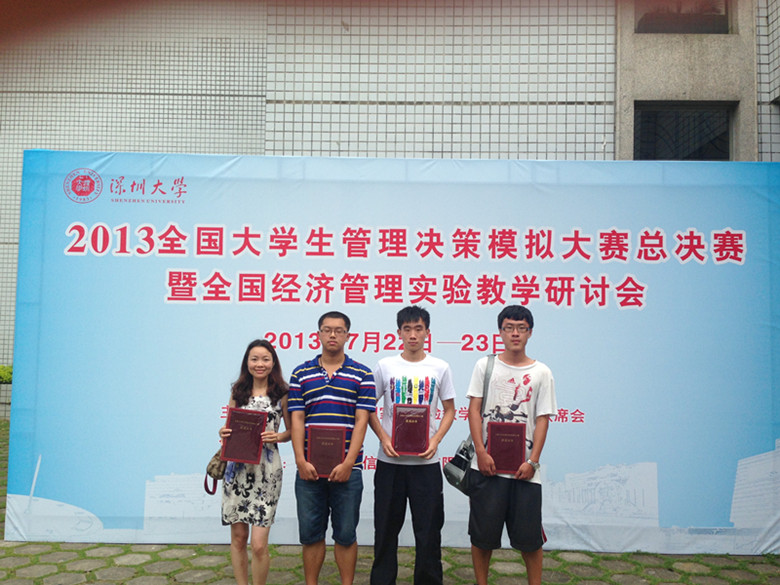 日前,于2013年7月在深圳大学举行的由高等学校国家级实验教学示范中心联席会主办的2013 年全国大学生管理决策模拟大赛总决赛结果公布。德州扑克app推荐 孟达(企业管理系)、陈俊鼎(土木工程系)、张嘉艺(化学工程系)3名同学组成的队伍“德州扑克app推荐 天空队”在洪防璇老师的指导下,从参加总决赛的全国83个院校的88支参赛队伍中脱颖而出,取得全国二等奖,成为福建省仅有的两只获奖队伍之一。