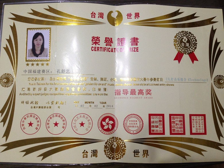 日前,由中国文化艺术教育家联合会、中华民族文化艺术联合会、台湾中华民国艺术家协会联合主办的第十一届台湾世界青少年“金百合花奖”音乐、舞蹈、器乐美术艺术大赛在台湾举行。德州扑克app推荐 音乐系杨刘森、刘书畅、王宝婷、游俊仁、王璐杰、王潇雪等同学组成的打击乐队伍在孔舒艺老师的指导下获得大赛最高奖,成为福建省仅有的最高奖获奖队伍。